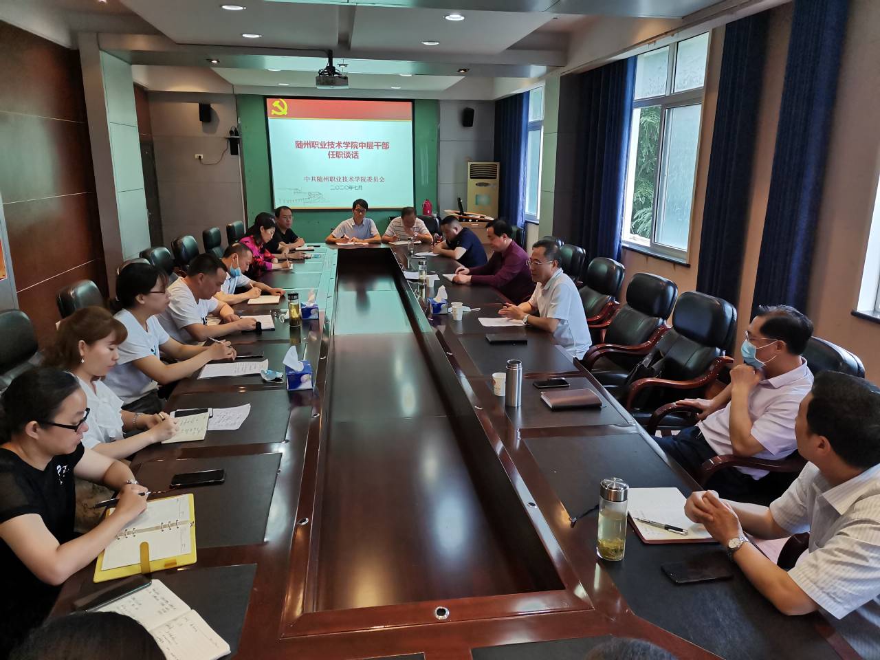 7月24日,随州职业技术学院党委对新提拔任命的17名中层干部进行任职集体廉政谈话,党委书记李德荣,党委委员、纪委书记李高东,党委委员、副院长梁学军分别与新任干部谈话。