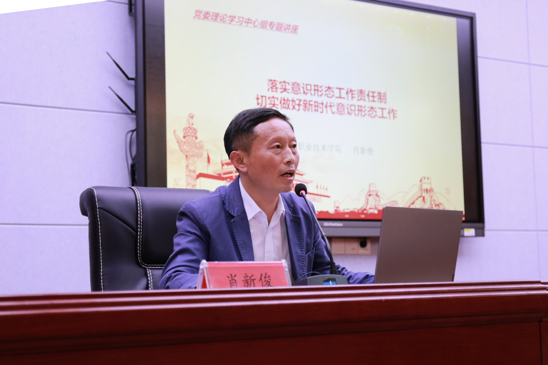 学院党委宣传(统战)部部长肖新俊以《落实意识形态工作责任制,切实做好新时代意识形态工作》为题作辅导报告。从分析当前意识形态工作面临的新挑战入手,引导大家科学应对挑战,努力实施好意识形态工作责任制、切实做好学院意识形态工作等三个方面给党员干部上了一堂意识形态理论党课,内容丰富,结合实际,尤其是对我院当前意识形态有关工作进行了部署,对下一阶段工作有着很强的指导性和针对性。