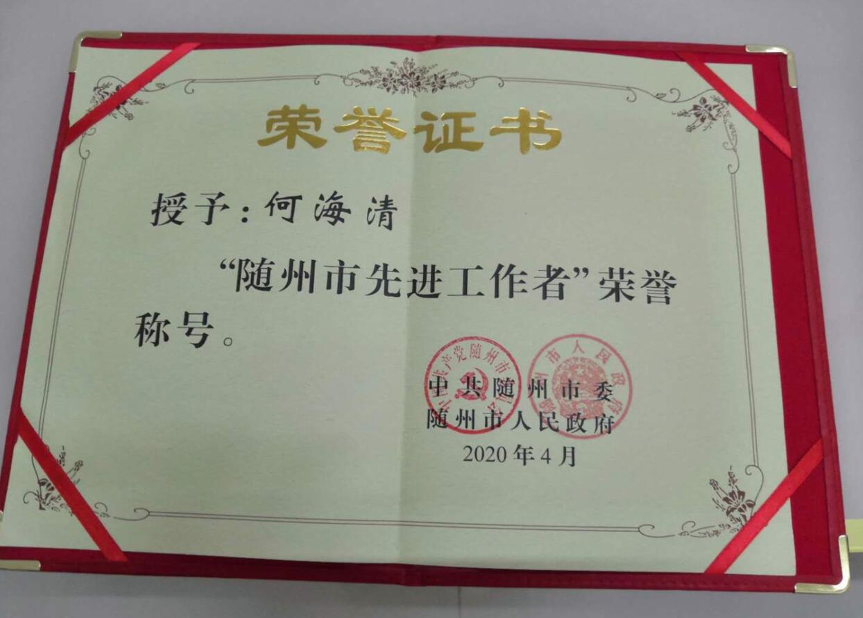 时代不会忘记奋斗者,人民更会记住好干部。2020年“五一”前夕,中共随州市委、随州市人民政府联合授予何海清同志“随州市先进工作者”荣誉称号。(编辑:张亦飞 审核人:肖新俊)