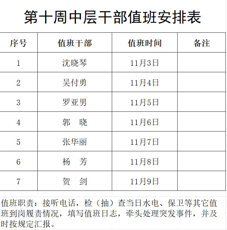 中层干部值班表(11月3日—11月9日)