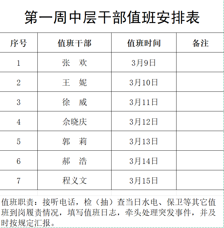 中层干部值班表(2026年3月9日—2026年3月15日)