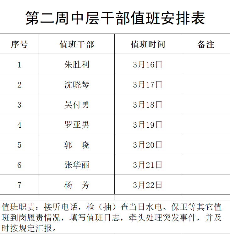 中层干部值班表(2026年3月23日—2026年3月29日)