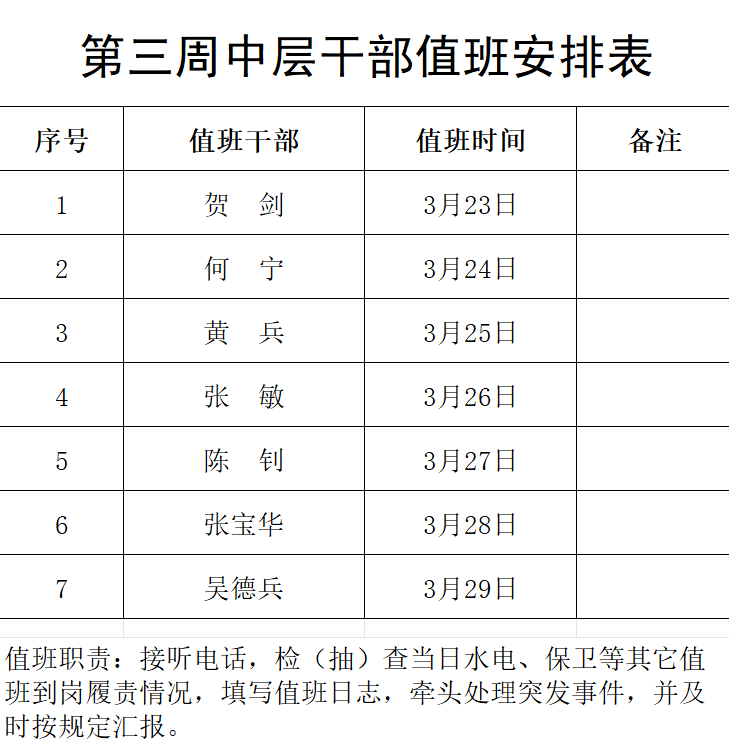 中层干部值班表(2026年3月23日—2026年3月29日)