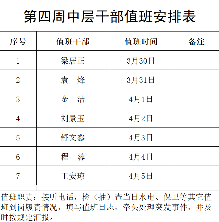 中层干部值班表(2026年3月30日—2026年4月5日)