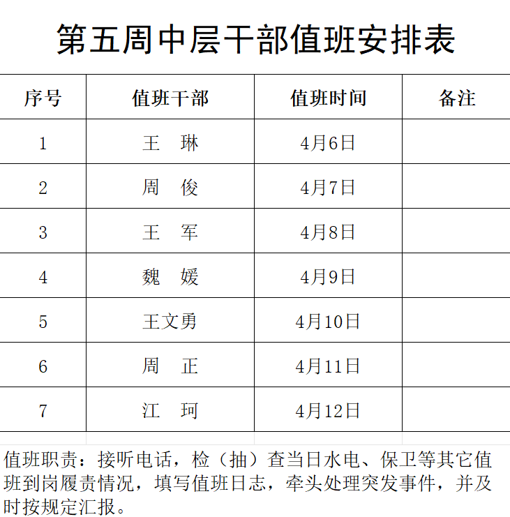 中层干部值班表(2026年4月6日—2026年4月12日)