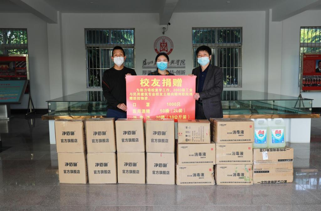 据张宇老师说:“3月20日,还在甘肃老家的王维在微信中对她说,等学校开学了,准备寄一些防疫物资给学校,以尽绵薄之力。”解封以后,王维返回新疆工作岗位,在学生复学前向母校捐赠了这批价值5000余元的抗疫物资,以自己的实际行动表达了一个随职学子对母校和老师的感恩之情。