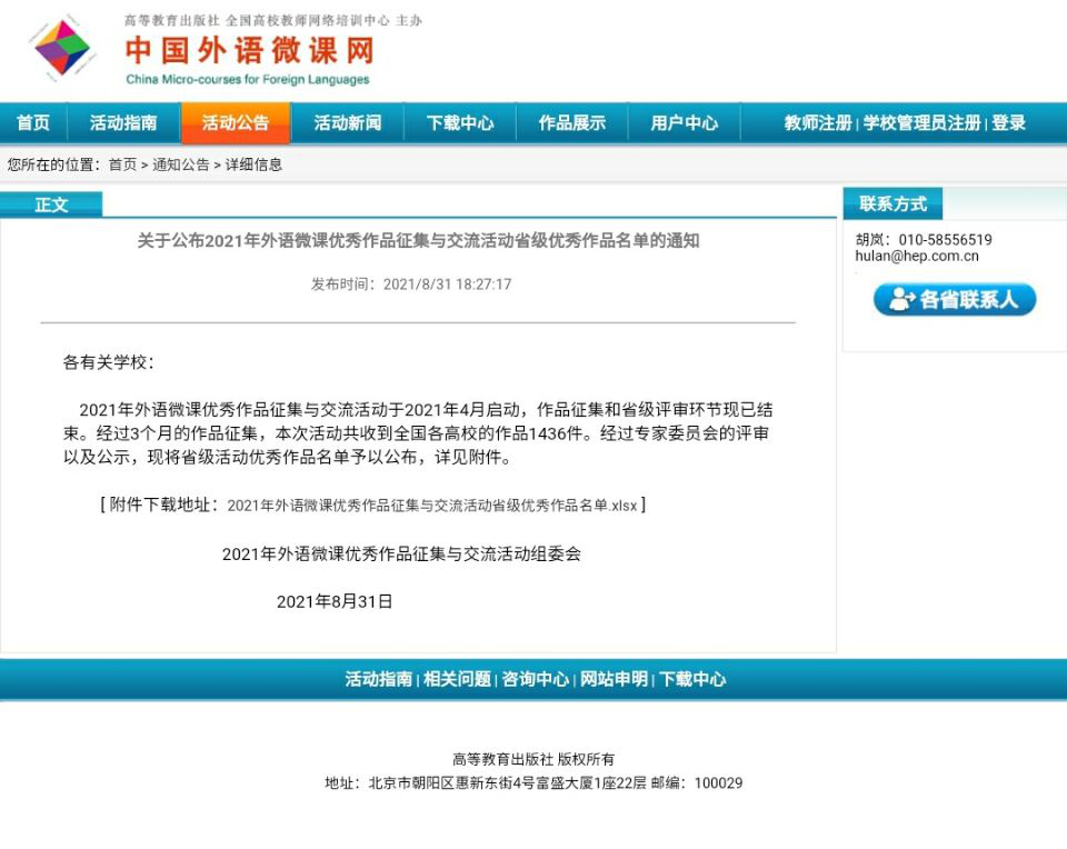据悉,本次比赛由教育部职业院校外语类专业教学指导委员会、高等教育出版社有限公司和全国高校教师网络培训中心联合举办。本次活动从四月份开始启动,参赛教师经过几个月认真打磨,我校2名英语教师终获佳绩,其中,获得本次湖北省一等奖的黄竞玲老师将继续参加全国微课设计比赛,冲击全国比赛赛项。